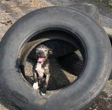 Этот щенок из пригорода Мемфиса, штат Техас, по неизвестным причинам остался один. Он нашел себе приют в старой автомобильной шине, и там его однажды заметили рабочие со склада. Люди начали подкармливать щенка, он поначалу был слишком робким, но потом начал встречать людей с очаровательной улыбкой. Однажды приветливого малыша кто-то из рабочих заснял на телефон и выложил снимок в фейсбук с просьбой помочь собаке, так как у щенка вся мордочка была в струпьях от какого-то кожного заболевания.